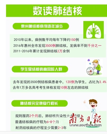 據(jù)惠州市結(jié)防所相關(guān)負(fù)責(zé)人介紹,惠州市近年(2011—2016年)發(fā)現(xiàn)肺結(jié)核病例2萬(wàn)余例,絕大部分患者都能治愈,治愈率達(dá)到90%以上。2010年的一項(xiàng)流行病學(xué)調(diào)查顯示,惠州市結(jié)核病發(fā)病率為千分之二,目前這一數(shù)字已降至不到千分之一。“去年發(fā)現(xiàn)3500例,發(fā)病率略低于全省平均水平,并且發(fā)病趨勢(shì)近年來(lái)逐年下降,2010年以來(lái),病例數(shù)平均每年下降約150例?!眲⒅緰|表示,這跟防控工作的成效以及人們防護(hù)意識(shí)的提高密不可分。然而,目前結(jié)核病的防治仍然面臨嚴(yán)峻的形勢(shì):一是發(fā)病人數(shù)多;二是耐藥結(jié)核病流行;三是學(xué)校存在發(fā)生結(jié)核病疫情的潛在風(fēng)險(xiǎn)。