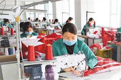 近期,甘肅省平?jīng)鍪徐o寧縣在做好疫情防控工作的同時(shí),積極推動(dòng)縣內(nèi)扶貧車(chē)間復(fù)工復(fù)產(chǎn)。截至目前,全縣57家扶貧車(chē)間已有39家恢復(fù)生產(chǎn),吸納帶動(dòng)了536名貧困群眾在家門(mén)口就業(yè),增收致富。圖為靜寧縣城關(guān)鎮(zhèn)的村民在當(dāng)?shù)匾患曳鲐氒?chē)間縫制衣服。王 毅攝(人民視覺(jué))