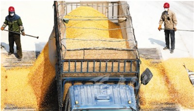 4月13日,在遼寧省鞍山市臺(tái)安縣新開(kāi)河糧食儲(chǔ)備庫(kù),兩名工作人員卸載剛剛收儲(chǔ)的玉米。